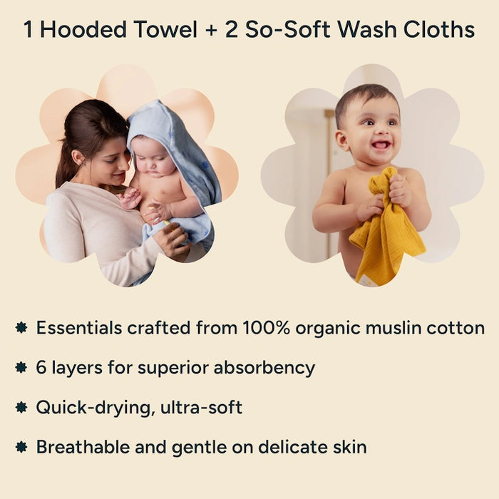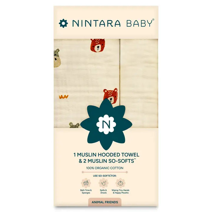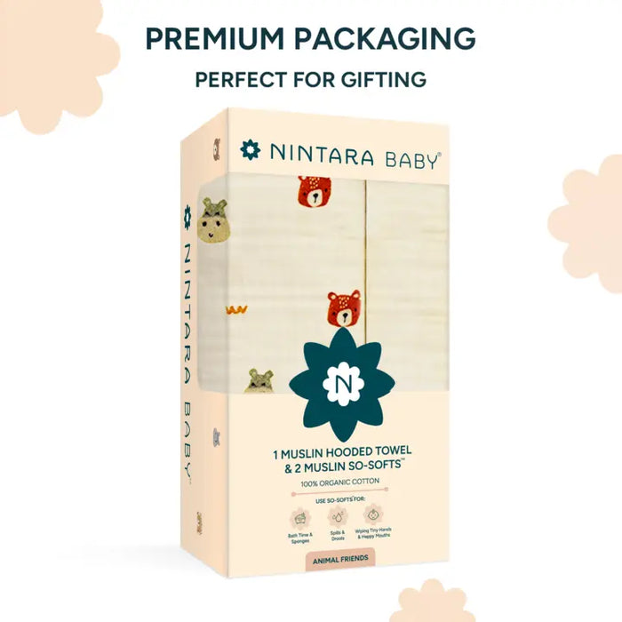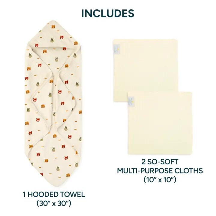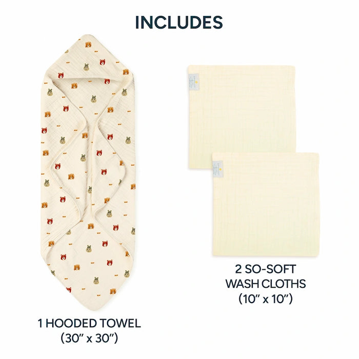 1 Muslin Baby Hooded Towel + 2 So-Softs™ Washcloths Set | Animal Friends