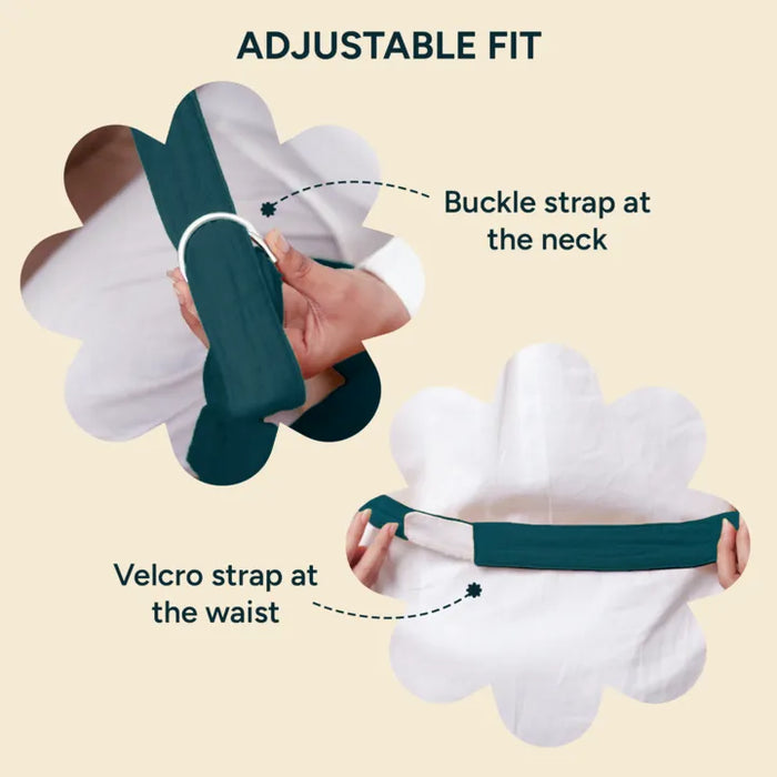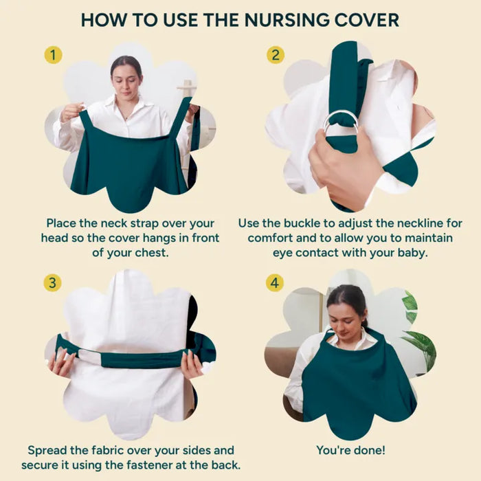 Place the nursing cover over your head and fasten the adjustable neck strap to a comfortable height.