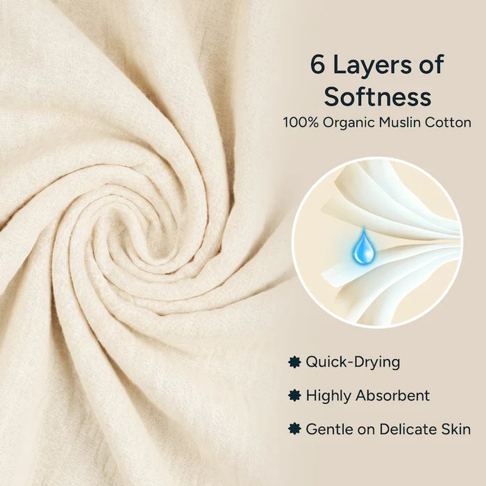 Features 6 layers of highly absorbent 100% muslin to dry your little one quickly.