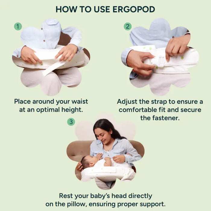 Place the Ergopod Feeding Pillow- Lucky Clover around your waist with the lumbar panel centred at your lower back and the clasp on your right side.