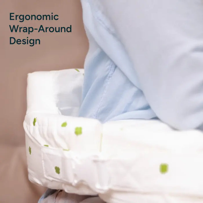 Place the Ergopod Feeding Pillow- Purple Skies around your waist with the lumbar panel centred at your lower back and the clasp on your right side.
