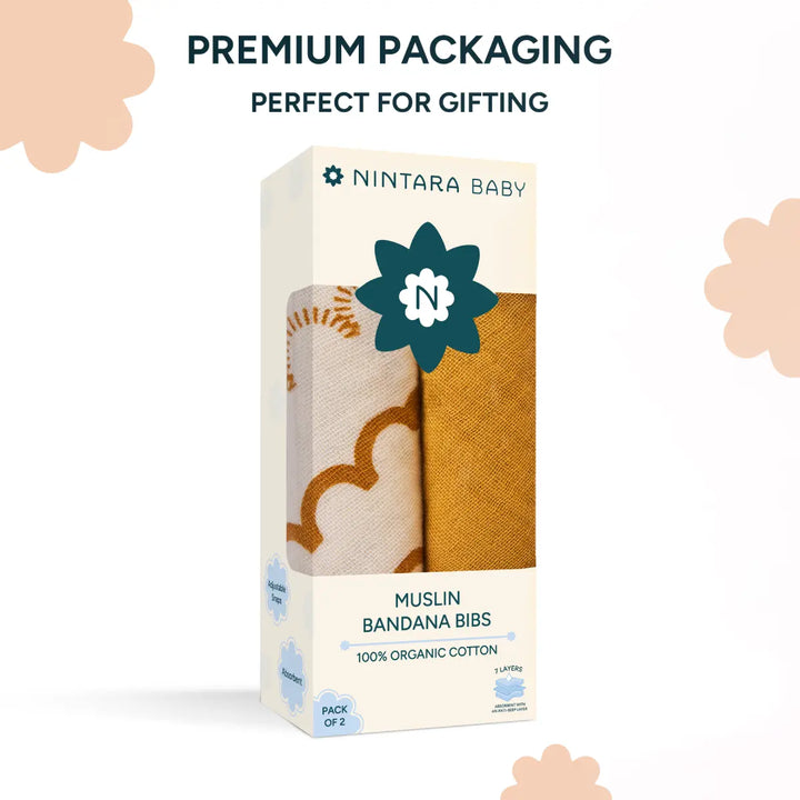 Our Mustard Pack- Set of 2 bandana bibs are carefully designed to manage the many messes that come with feeding and teething.
