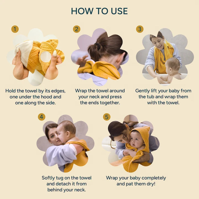 Ensure your baby is fully wrapped in the Solids Set (Set of 2) towels, with the hood securely placed on their head for extra warmth.