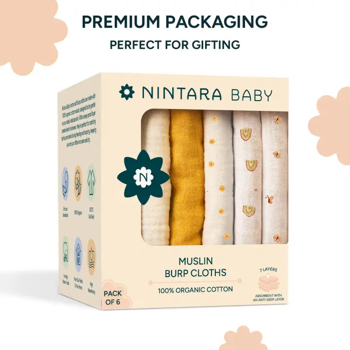 Our Golden Flutter Pack- Burp Cloth (Set of 6) are thoughtfully crafted to tackle the everyday messes that come with feeding and drooling.